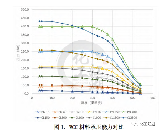 無論是ASME標準還是EN標準都列出了一些ASTM標準材料的壓力溫度等級,即材料在不同溫度下的承壓能力。本文選取了常見的閥體材料:碳鋼WCC,合金鋼 WC9和C12A進行研究,來對比兩個標準中相同材料在標準壓力等級下的承壓能力的差別。