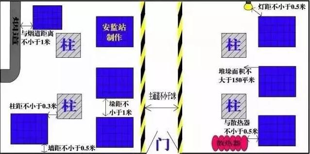 儲(chǔ)存物品與風(fēng)管、供暖管道、散熱器的距離不應(yīng)小于0.5米。與供暖機(jī)組、風(fēng)管爐、煙道之間的距離在各個(gè)方向上都不應(yīng)小于1米?!秱}(cāng)儲(chǔ)場(chǎng)所消防安全管理通則》(GA1131-2014)6.14