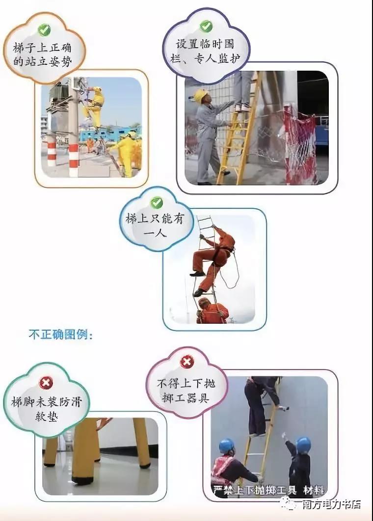 (3)硬質(zhì)梯子的橫檔應(yīng)嵌在支柱上, 梯階的距離不應(yīng)大于40cm,并在距梯頂1m處設(shè)限高標(biāo)志??吭诠茏由?、導(dǎo)線上使用梯子時(shí),其上端需用掛鉤掛住或用繩索綁牢;伸縮梯調(diào)整長度后,要檢查防下滑鐵卡是否到位起作用,并系好防滑繩,梯角沒有防滑裝置或防滑裝置破損、折梯沒有限制開度的撐桿或拉鏈的嚴(yán)禁使用。