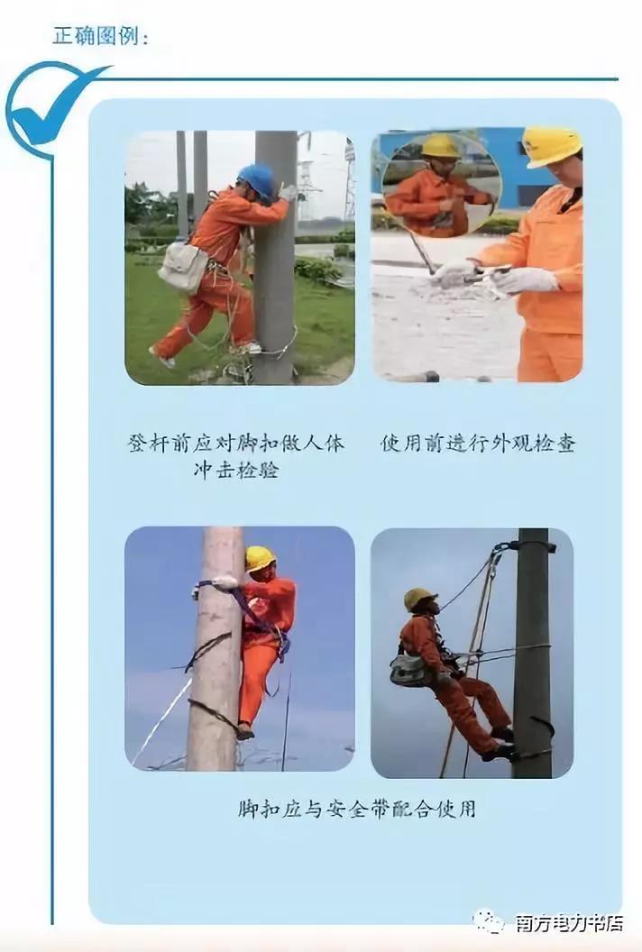 (1)登桿前,使用人應(yīng)對(duì)腳扣做人體沖擊檢驗(yàn),方法是將腳扣系于電桿離地0.5m左右處,借人體重量猛力向下蹬踩,腳扣及腳套不應(yīng)有變形及任何損壞后方可使用。