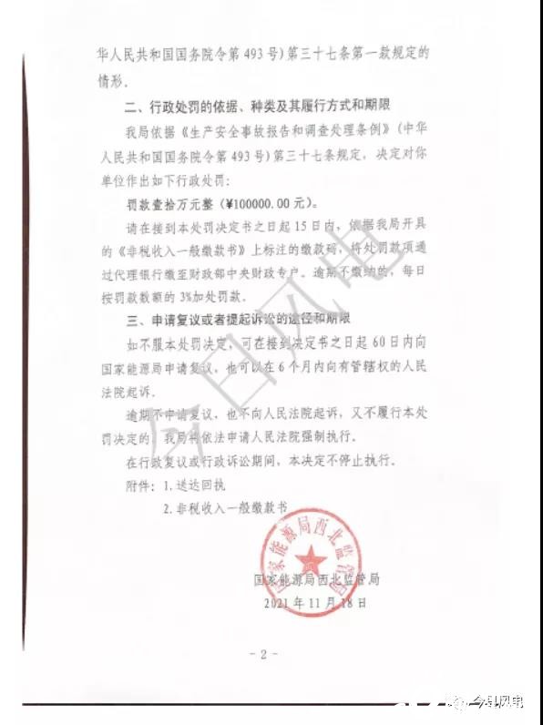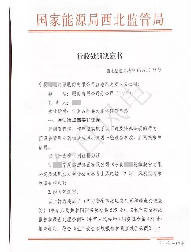 近日,國(guó)家能源局西北監(jiān)管局發(fā)布【2021】28號(hào)行政處罰決定書,根據(jù)該處罰決定,因設(shè)備管理不到位造成風(fēng)機(jī)倒塔一般設(shè)備事故,且遲報(bào)事故信息,根據(jù)《生產(chǎn)安全事故報(bào)告和調(diào)查處理?xiàng)l例》(中國(guó)人民共和國(guó)國(guó)務(wù)院令493號(hào))第三十七條規(guī)定,對(duì)寧夏銀星能源股份有限公司鹽池風(fēng)力發(fā)電分公司罰款10萬元。