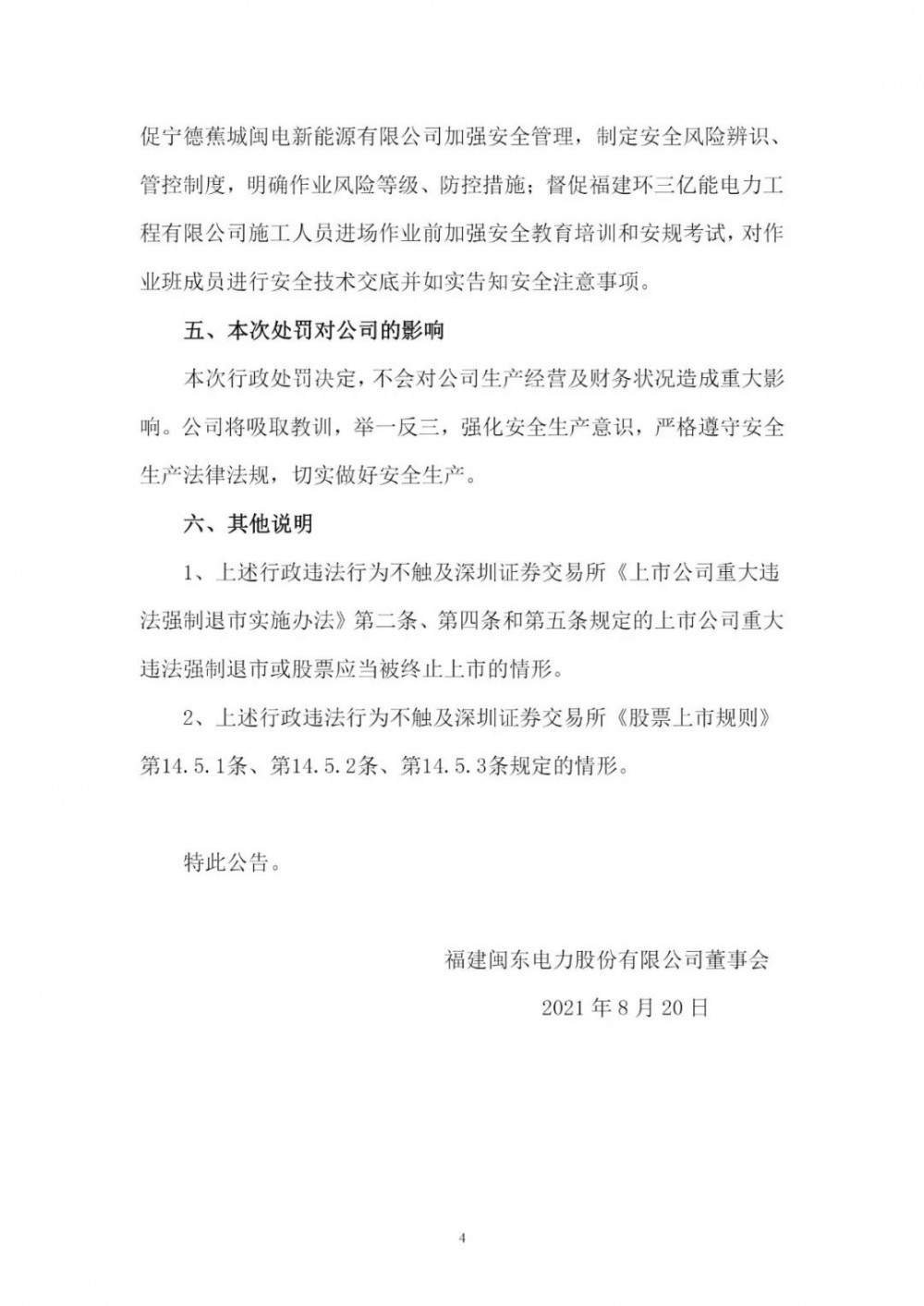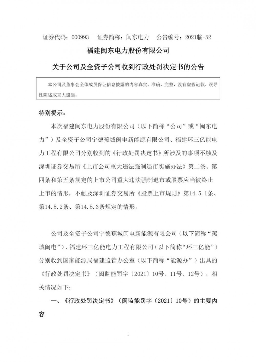 近日,福建閩東電力股份有限公司(以下簡稱“閩東電力”)向社會(huì)公眾披露了《關(guān)于公司及全資子公司收到行政處罰決定書的公告》,閩東電力及旗下全資子公司寧德蕉城閩電新能源有限責(zé)任公司(以下簡稱“蕉城閩電”)、福建環(huán)三億能電力工程有限公司(以下簡稱“環(huán)三億能”)分別收到國家能源局福建監(jiān)管辦公室簽發(fā)的《行政處罰決定書》。