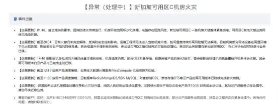 火災(zāi)公告顯示,11日凌晨01:46,接當(dāng)?shù)叵酪?,因消防澆水持續(xù)進(jìn)行,機(jī)房開始出現(xiàn)積水和滲漏,電路存在短路風(fēng)險(xiǎn),新加坡可用區(qū)C一棟機(jī)房大樓整體緊急斷電,可用區(qū)C其他大樓業(yè)務(wù)網(wǎng)絡(luò)已陸續(xù)恢復(fù)。